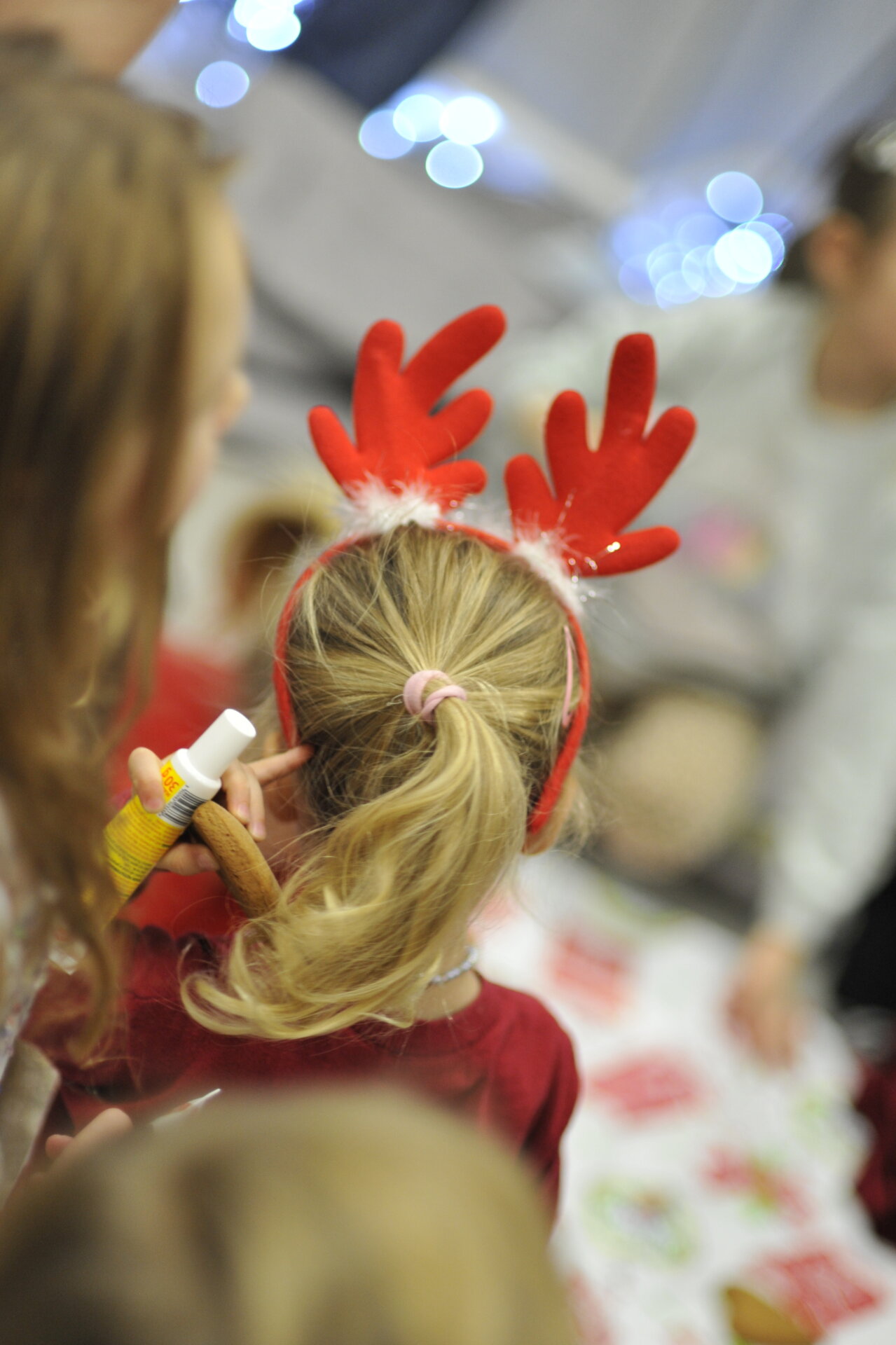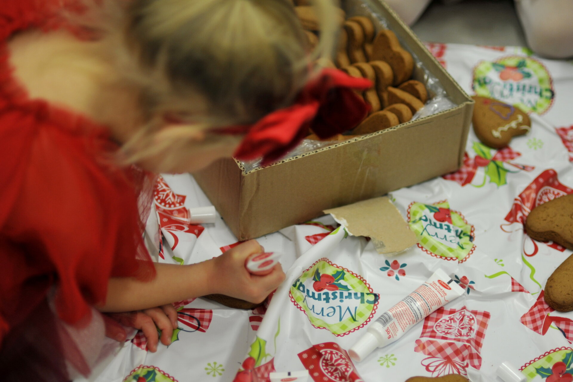 Ale to nie koniec wieczoru. Dzieciaki, szczególnie po tej śledczej pracy, zasłużyły na prezenty od Świętego Mikołaja. Kolejka ustawiła się natychmiast, ale dla nikogo uścisku dłoni Mikołaja i prezentu nie zabrakło. A potem jeszcze był czas na malowanie pierników i świątecznych ozdób. I chwila dla rodziców na pogawędki. Wieczór udany, wszyscy uśmiechnięci.