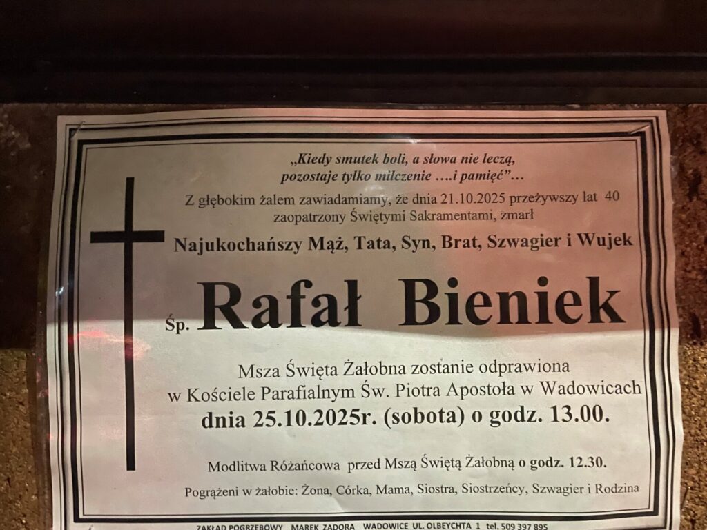 Uroczystości pogrzebowe odbędą się w dniu 25 października 2025 r. o godz. 13:00 w Kościele Parafialnym Św. Piotra Apostoła w Wadowicach.